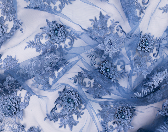 3-Dimensional Blue flowers layered on enchanted forest embroidery, topped with luminous pearls, floating on a sheer tulle ground. This intricately detailed textile is such a red carpet look! Perfect for couture designs and luxury evening gowns. Add a matching blue lining for a more subtle look. Lining may be necessary for an opaque look.